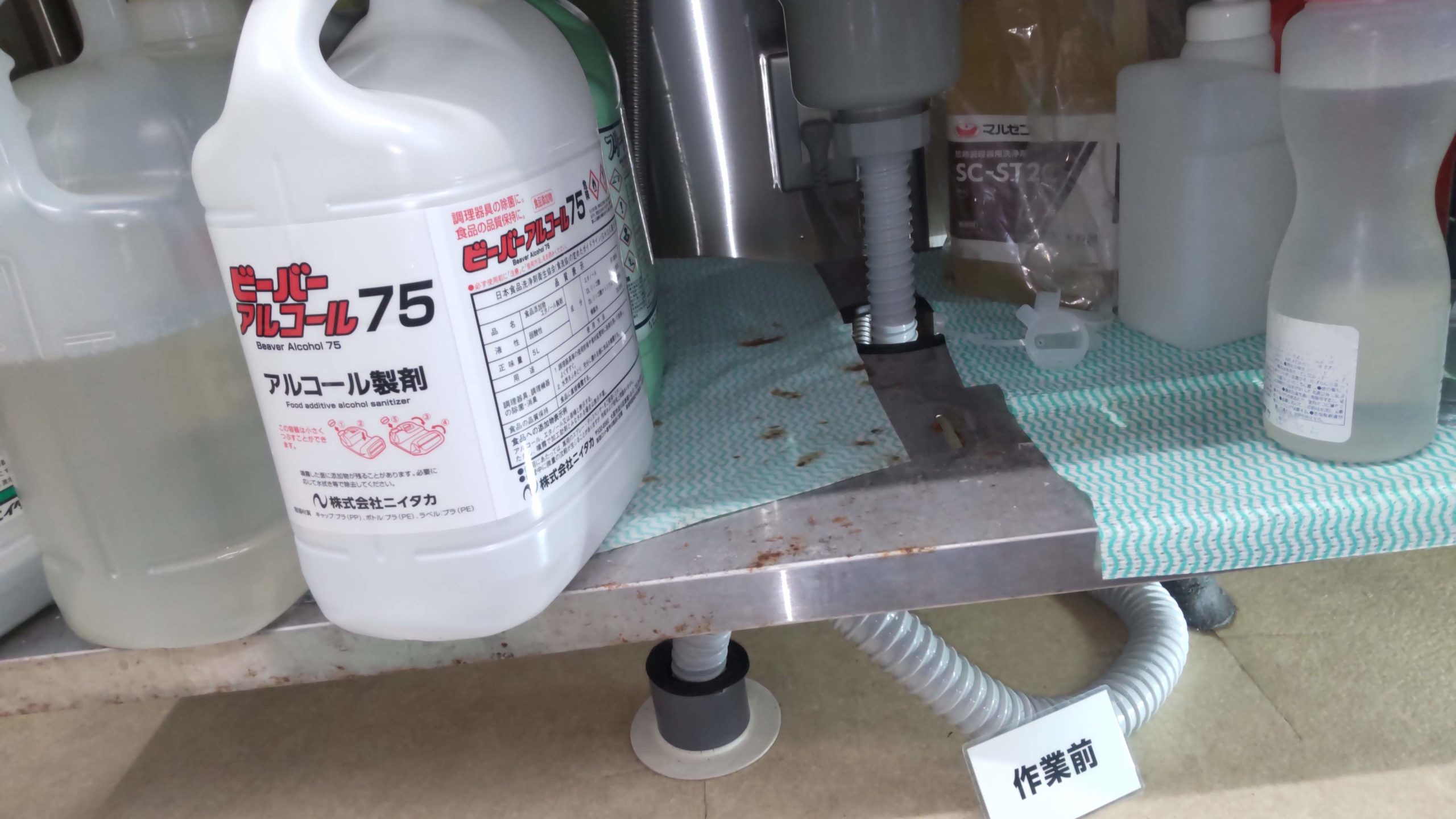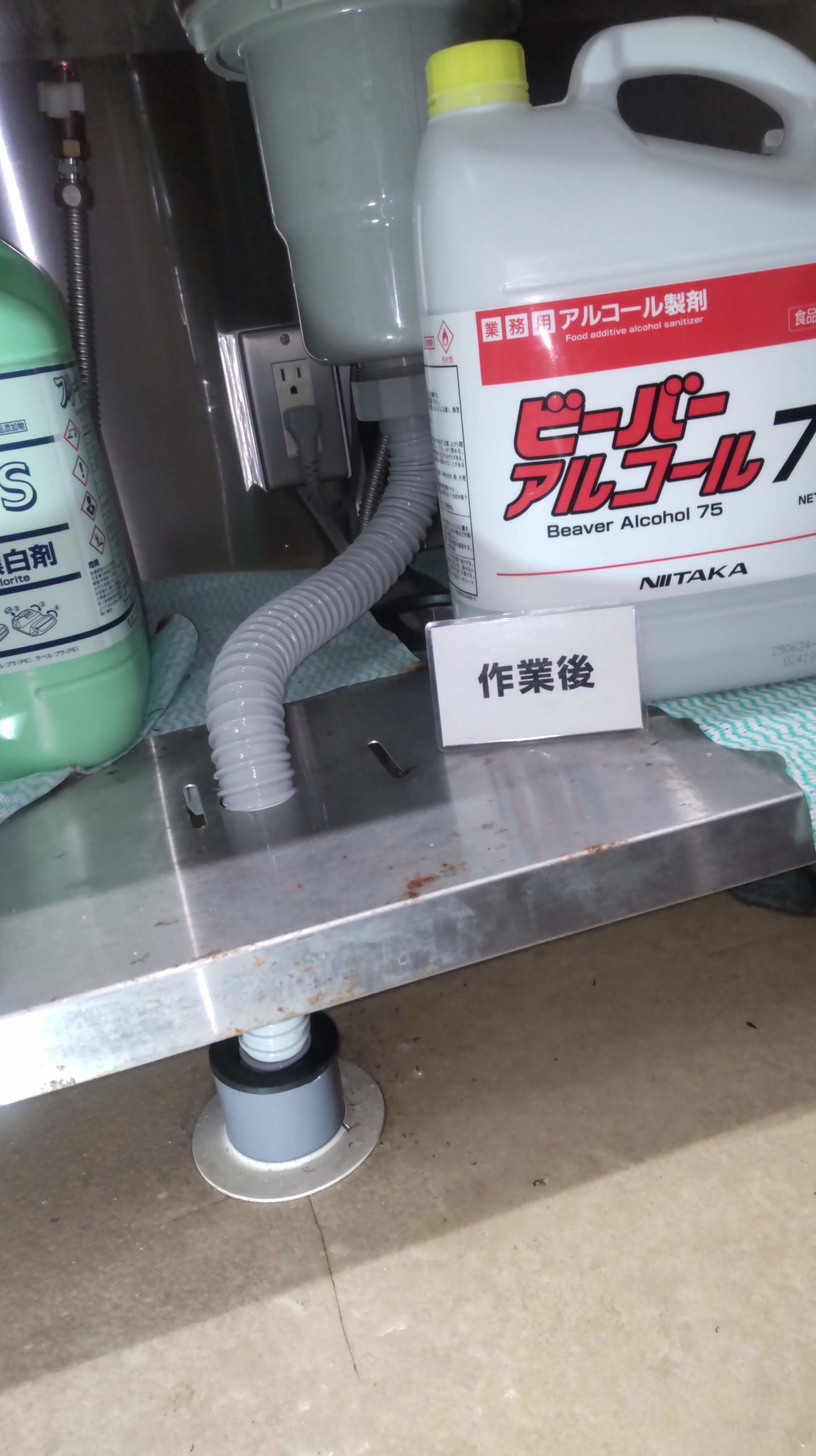 シンク上から洗浄ホースを入 れ問題なくグリストラップま で…洗浄ホースが通過しました。 その際、固形物や汚れた水も 出てこない事から詰まりは無 さそうです。 高圧洗浄作業中にシンク下の 蛇腹ホースを見て詰まりが無 ければ… 間違いなく、これが原因だと 思われる状態を確認しました。