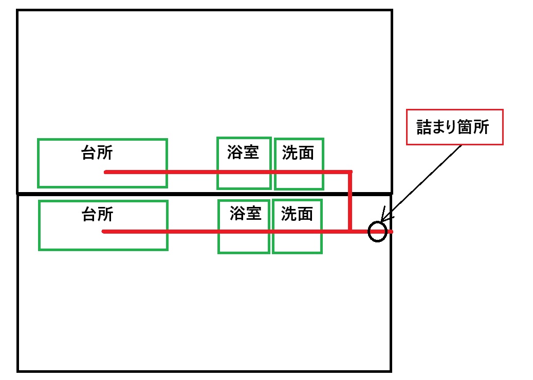 投稿も、あまり似たような案件 を投稿していても意味無いなー って思っていたら間が空きまし た。 今日はマンション6階で隣合う 部屋が同時に詰まっているっと いう案件です。 部屋の排水管の位置や詰まり の位置に関しては部屋の真下 がリフォームの為、スケルト ンなので… 排水管の接続状態が判ってる 状態での作業になります。 下記が排水管の位置図になり ます。