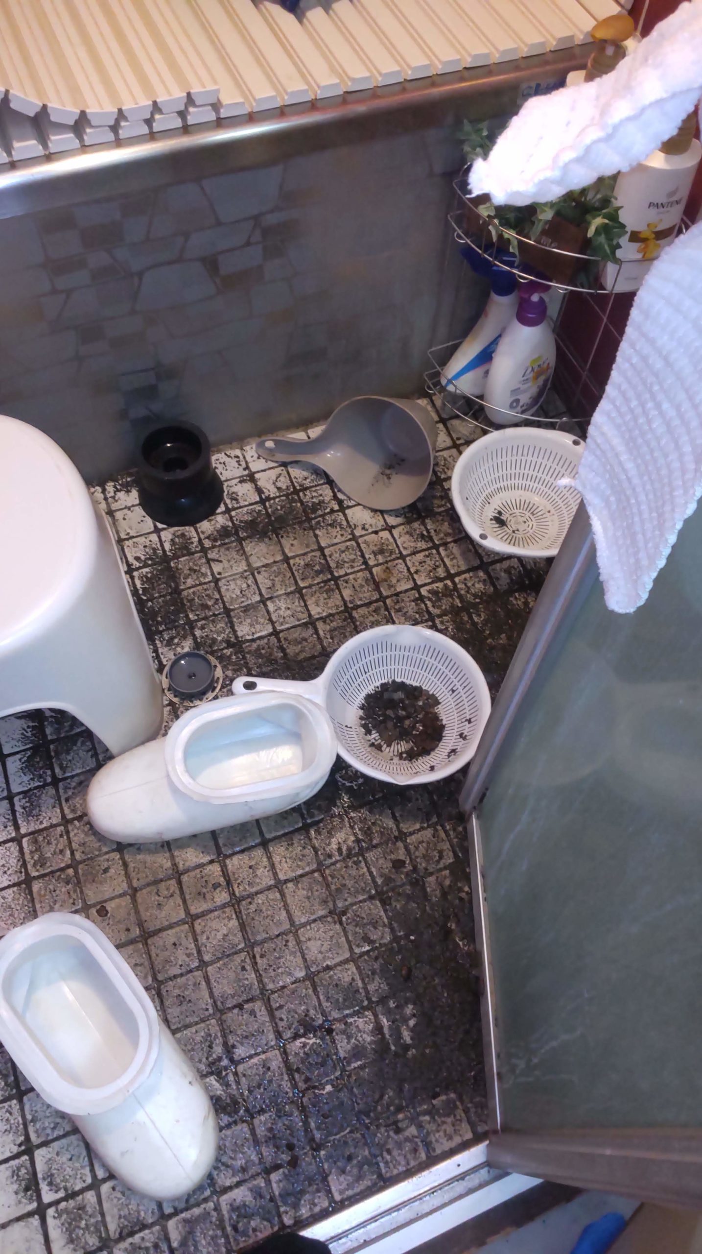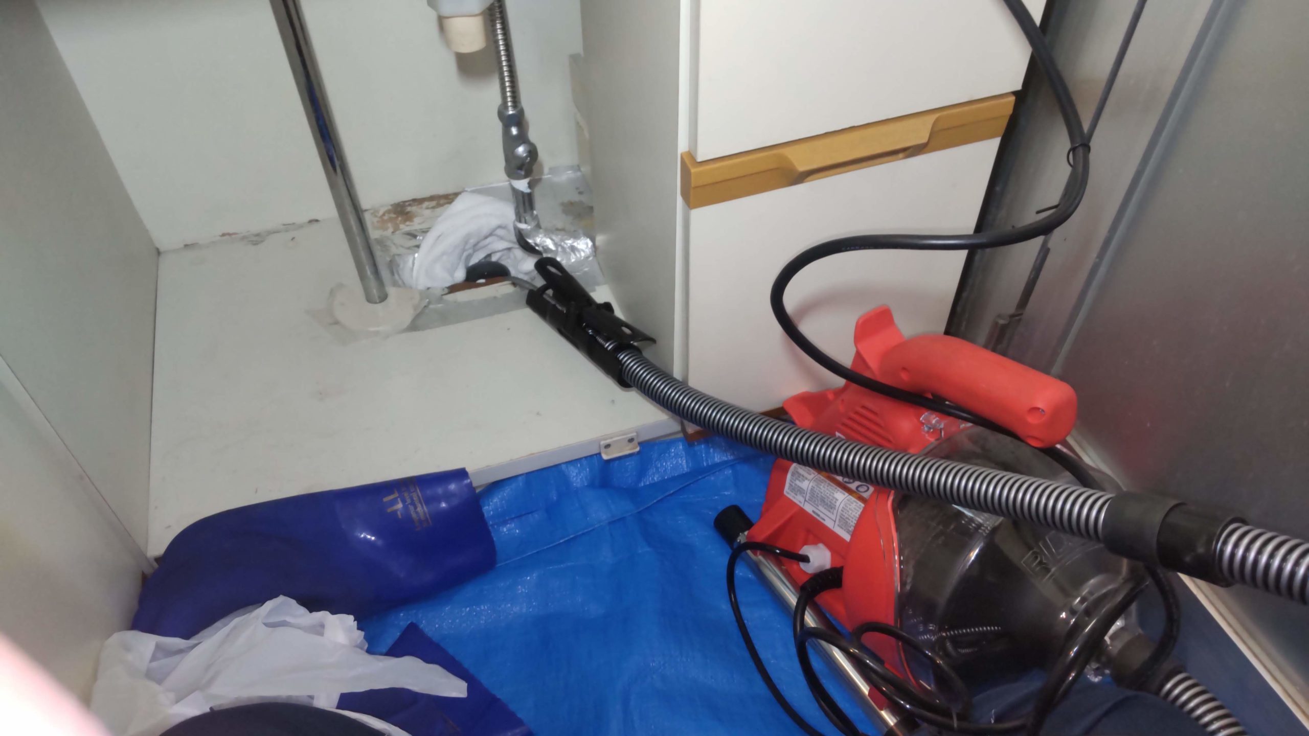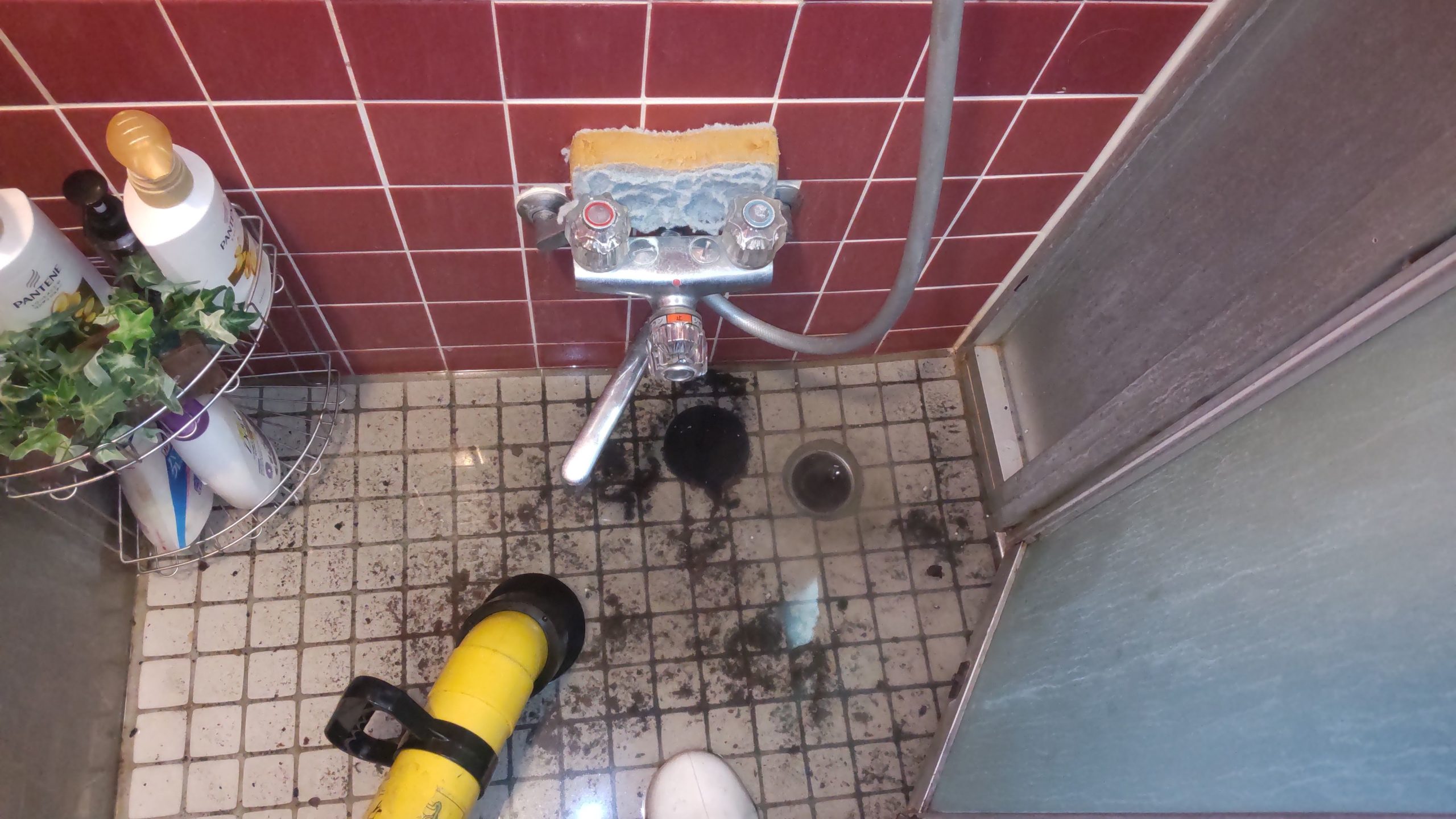 排水設備から空気が逃げない ようにローポンプを1時間程、 粘りましたが‼ 全然、解消しません‼ それなら、高圧洗浄を試しに やってみる事にしました。 浴室から漏水しないレベルで しか作業できないので慎重に やってみました。