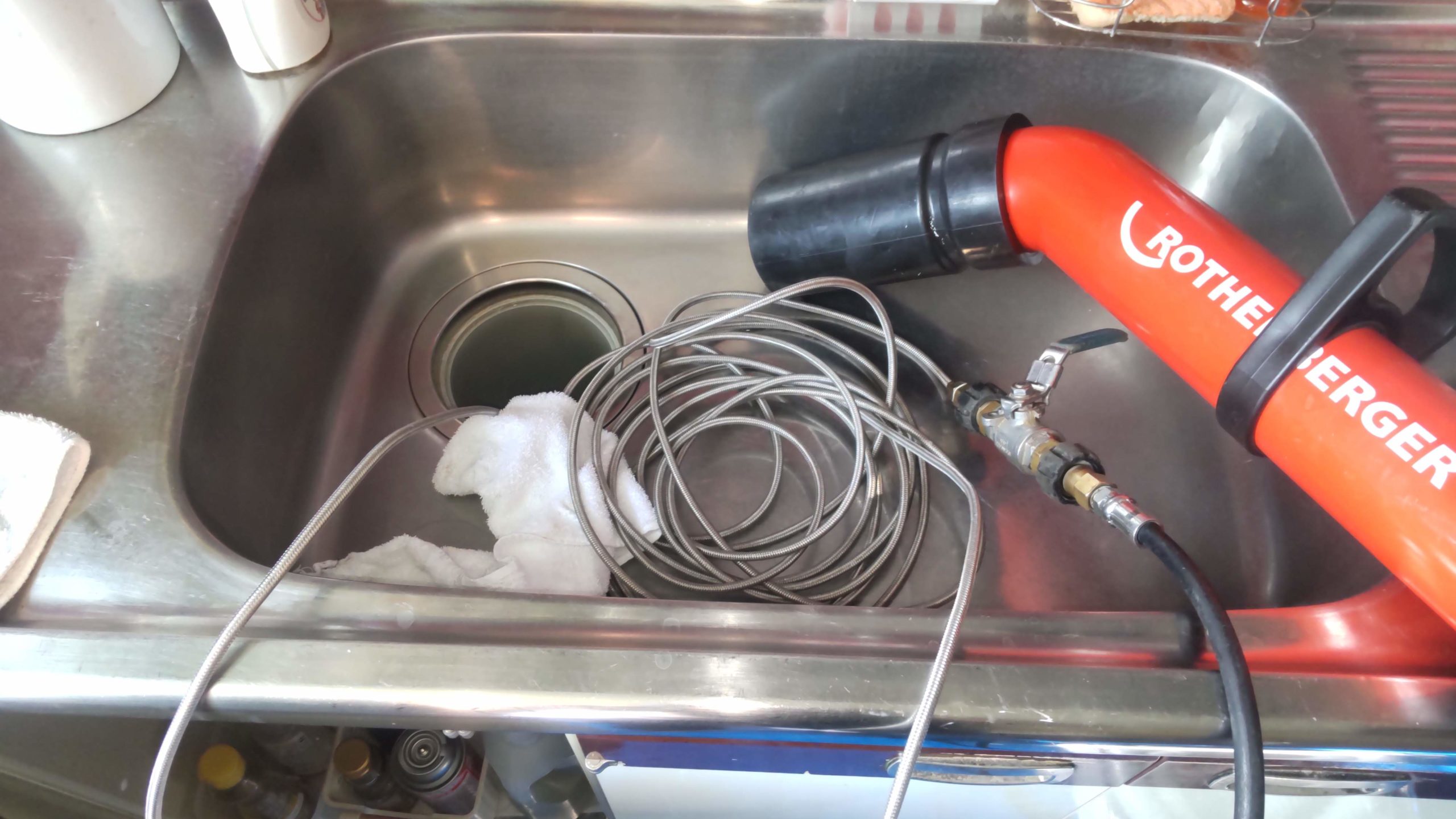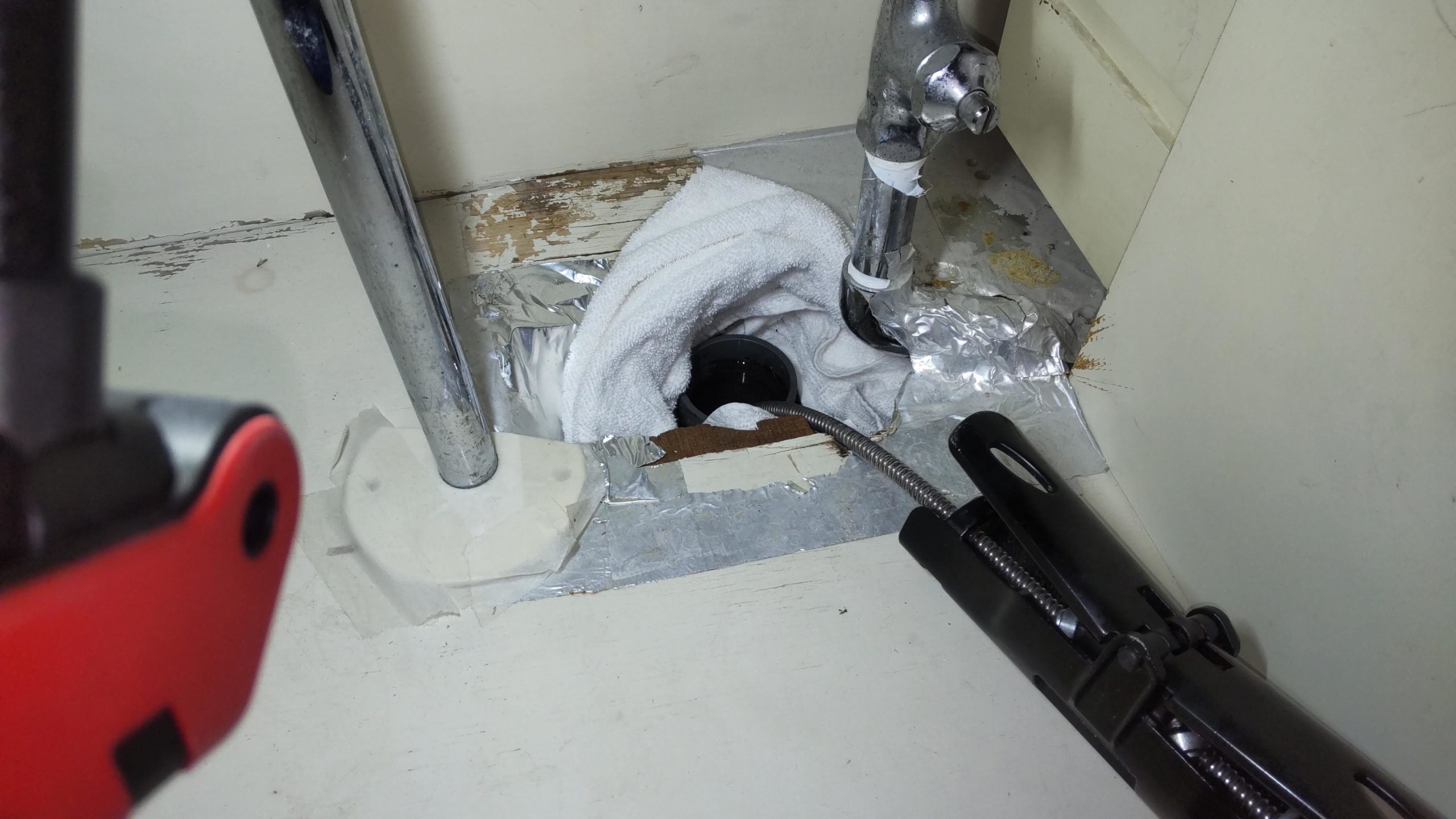 しかし、エルボとエルボの間隔 が狭いので洗浄ホースが前に進 みません。 それなら、洗面からトーラー作 業を試してみます。