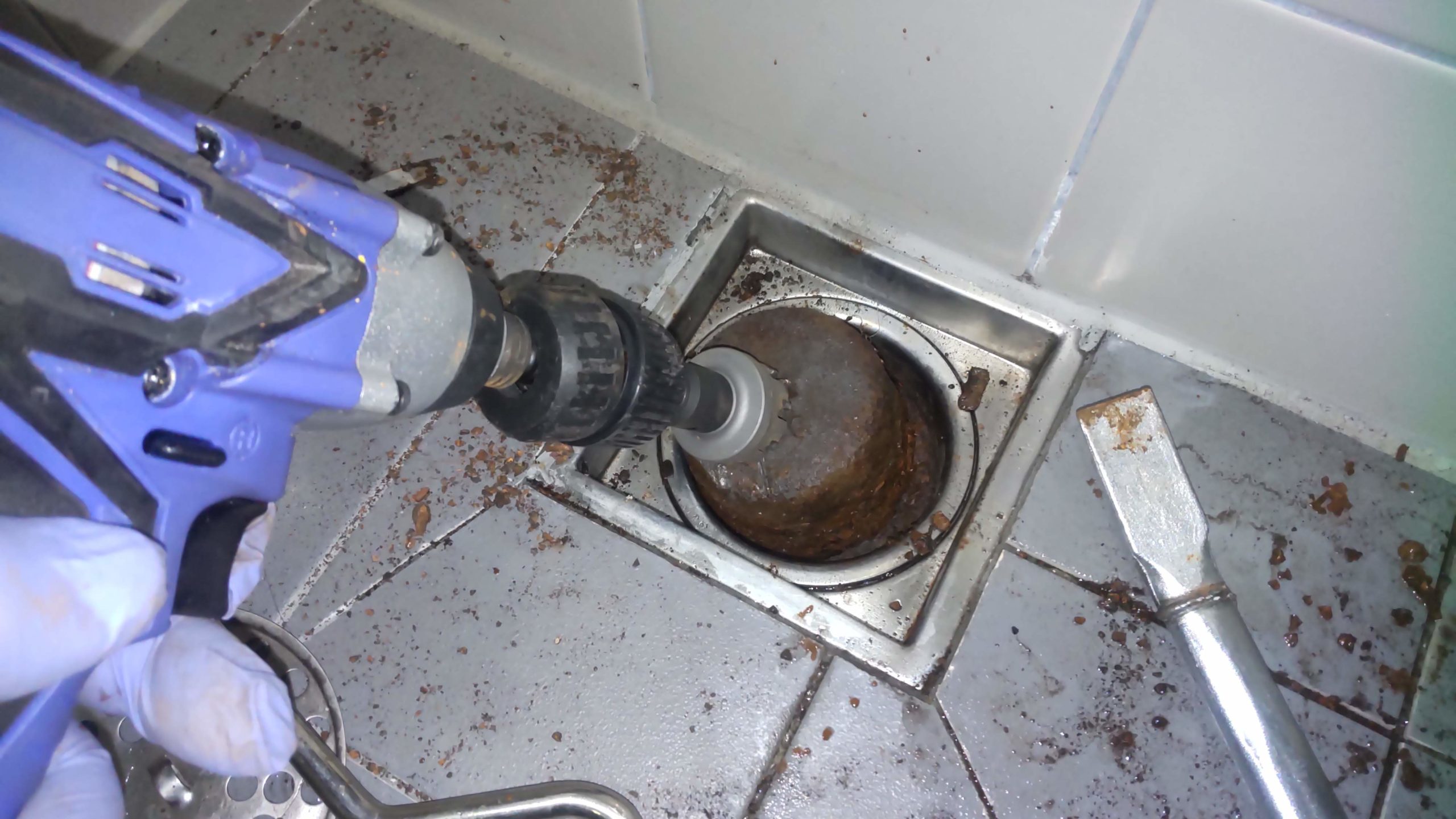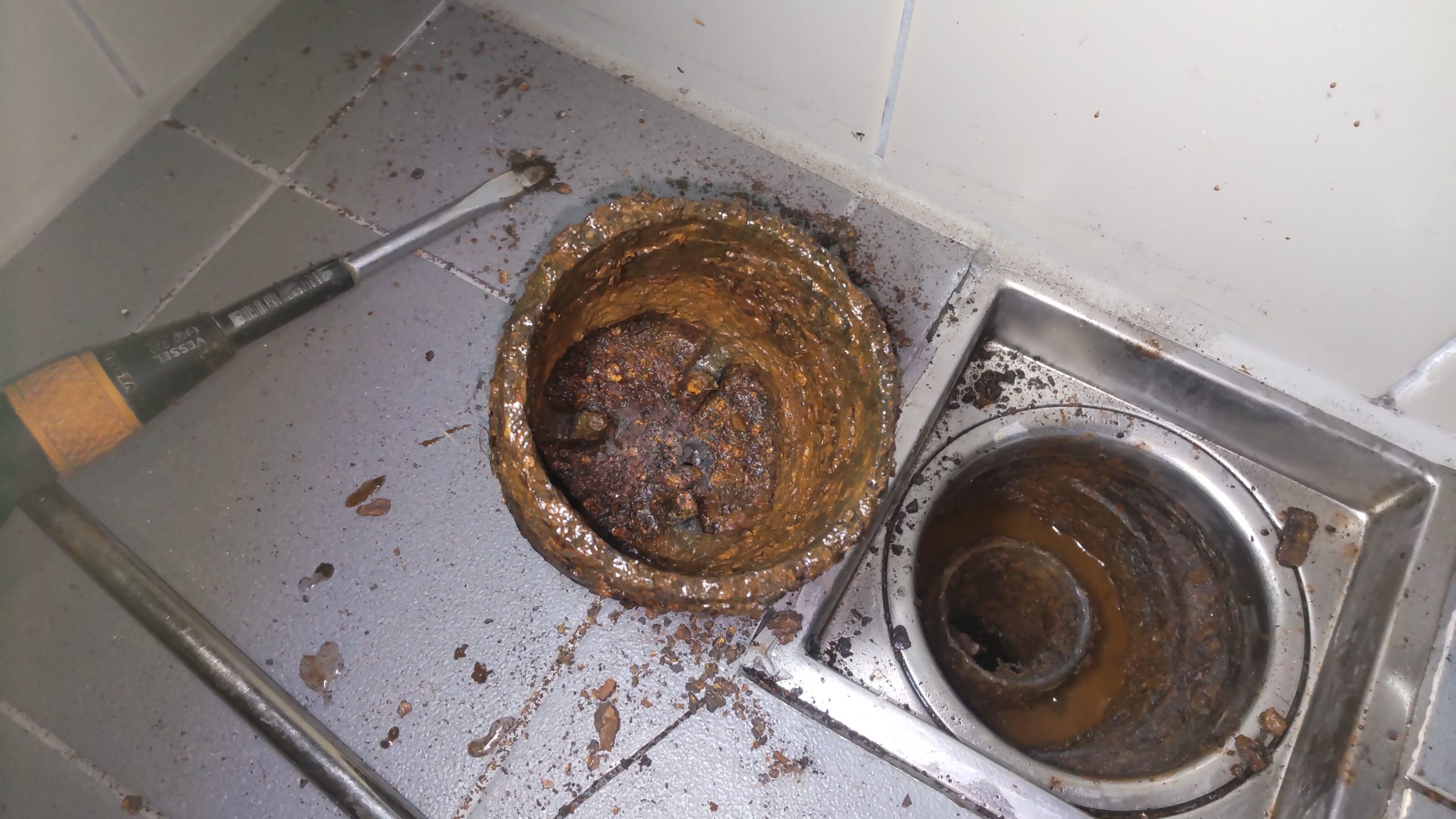 久々に、ダブらない案件が ありました。 トイレ交換、蛇口交換等、 今迄の水回りのトラブルを 一気に解消して欲しい案件 で… 浴室排水ワンが外れないの で外して欲しいというのも 案件に含まれてました。 作業前の画像が、コチラ… お客さんが、凄く格闘した 上で依頼されたのが判るよ うな浴室の床のヨゴレでし た。