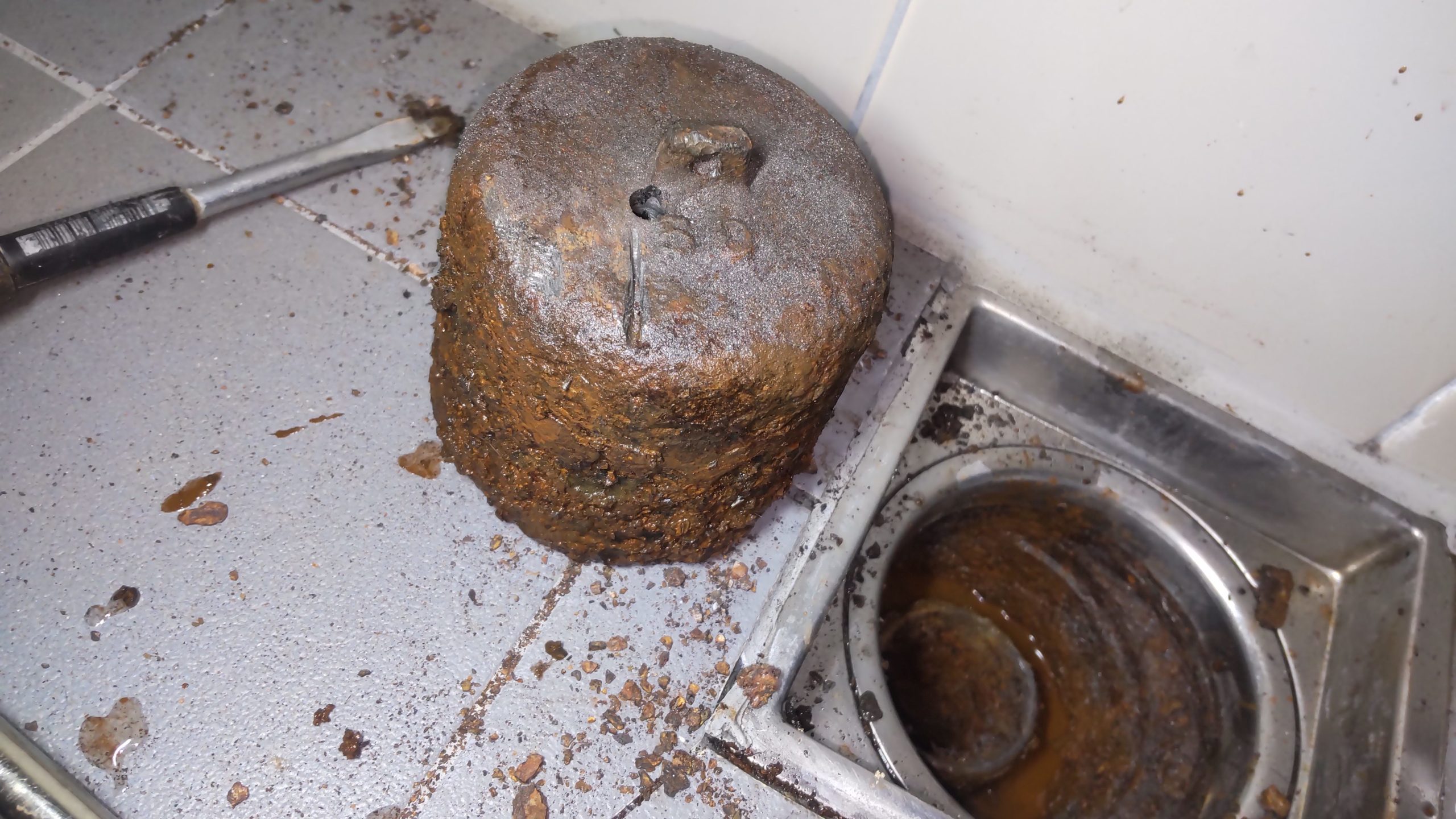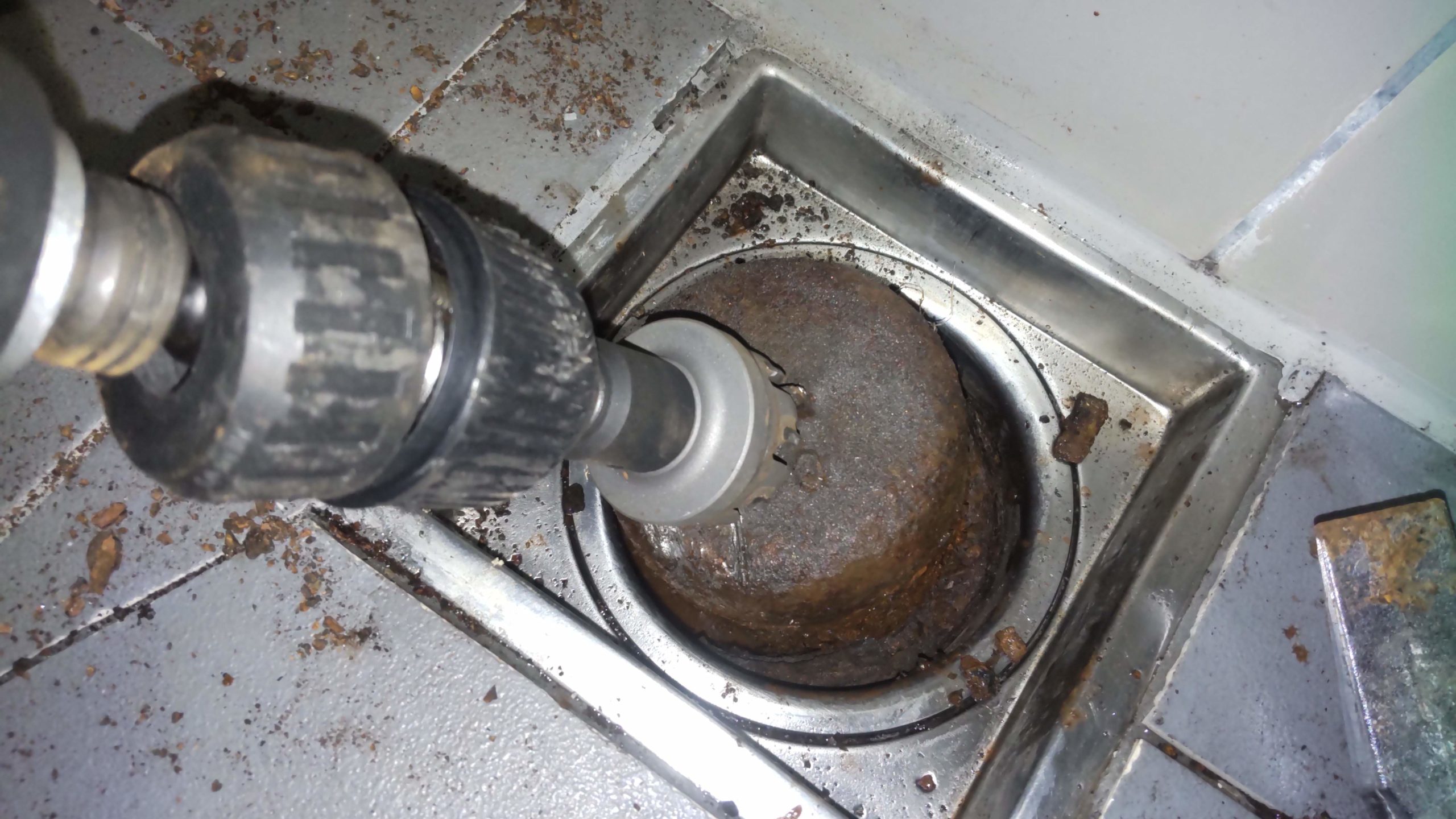 最近は、ユニットバス交換す るなどで排水ワンが外れない という案件は、あまり聞かな い案件になってました。 10年近く前に、緊急かけつ け水道の会社にいる時、受け た事がありましたが、解消ま でには至りませんでした。 しかし、今回、作業して画期 的な対処法を見つけた様な気 がしました。(笑) ワンをレシプロソーで切ろう と考えましたがスペースが無 いので無理です。 そこで、マルチツールで、壊 そうと考えたのですが、意外 と硬いので、早々、諦めまし た。 そこで、バルでコジり固着を 無くした上で… ステン用のホールソーで… ワンを回すイメージで作業 すると段々、浮き上がって 着て… 後はマイナスドライバーで抉っ て見事外す事が出来ました。
