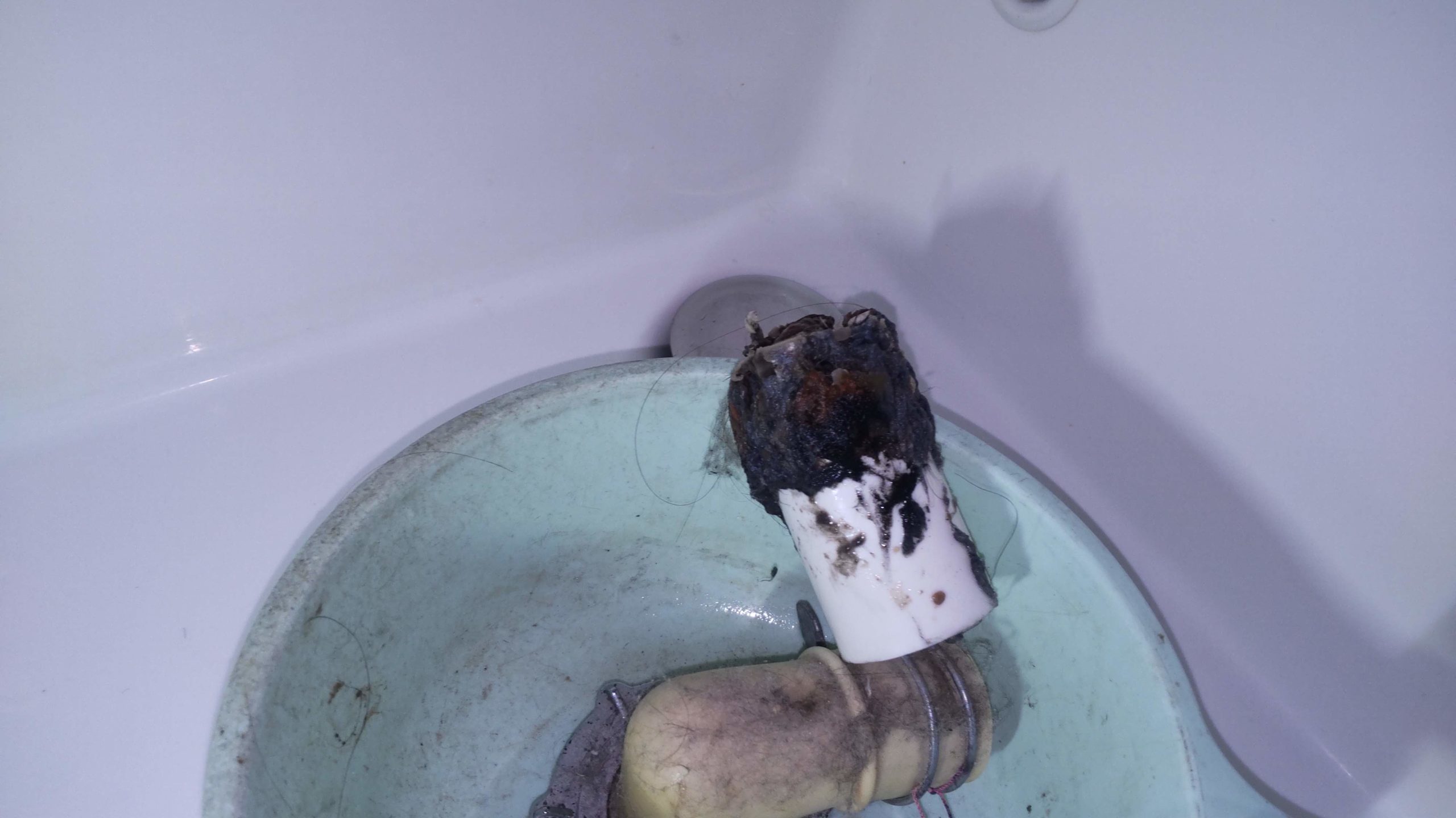 繊維カスが詰まり、明らかに 排水不良と考えれます。 トラップを外し高圧洗浄しト ラップを洗浄します。