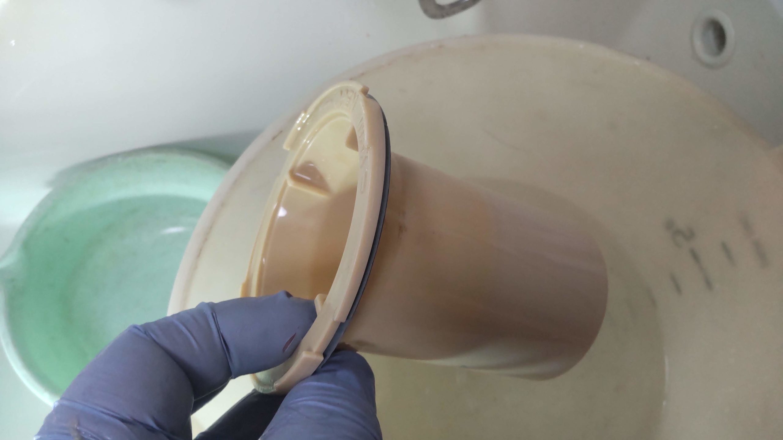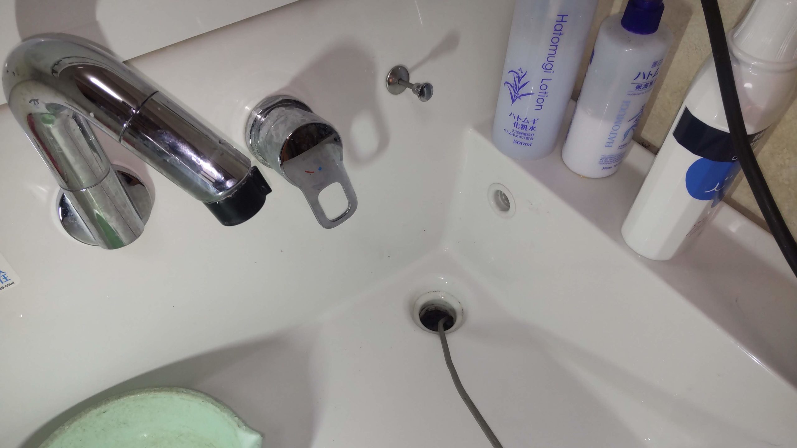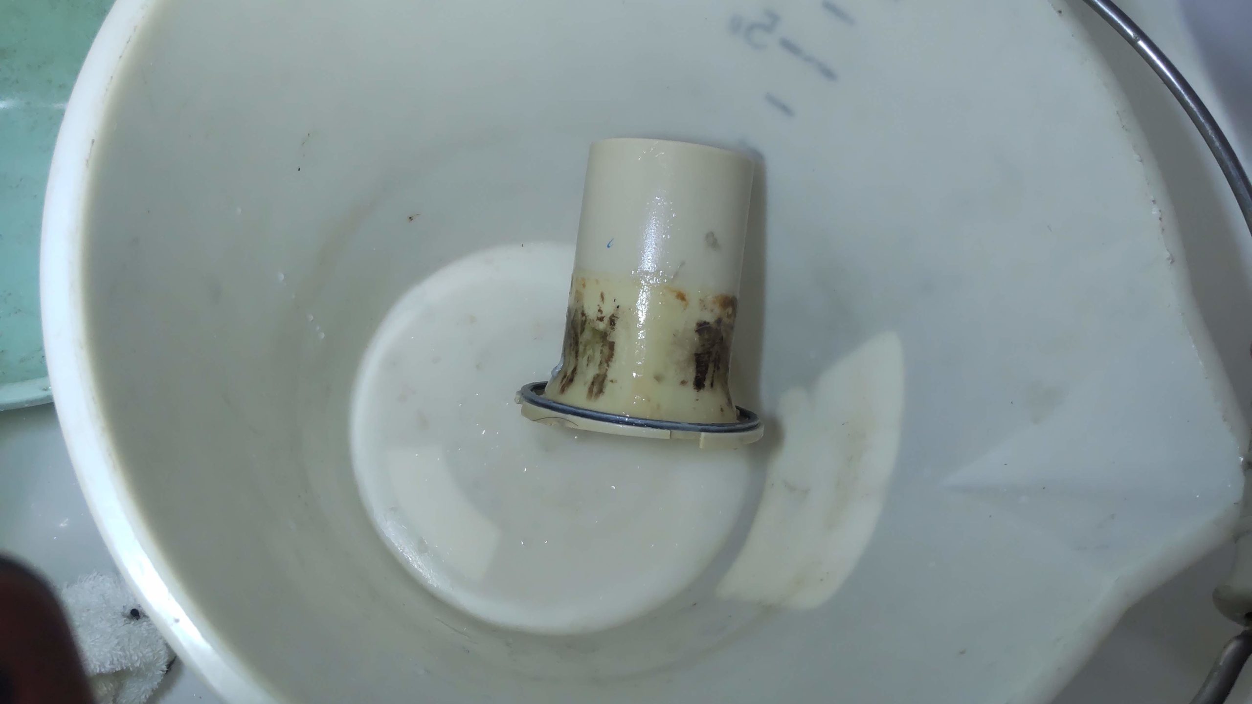 トラップを洗浄しましたが 錆び汚れがトラップに沁み 込んでる様な感じで、 これが、限界でした。 次が洗面台で、先ずは吸引 ポンプでシンク下のS字管を 洗浄します。